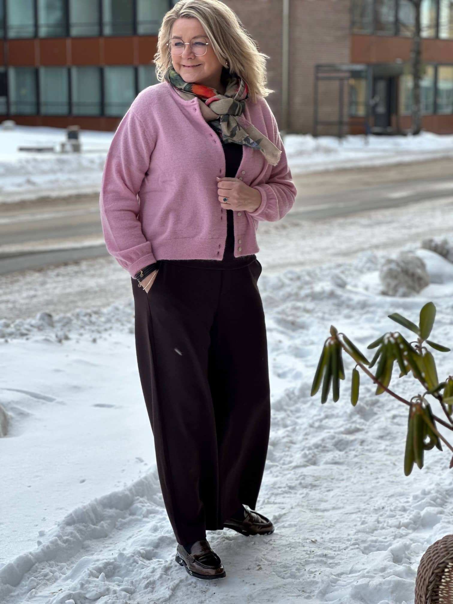 Bukser med vide ben, lommer og strikk i livet