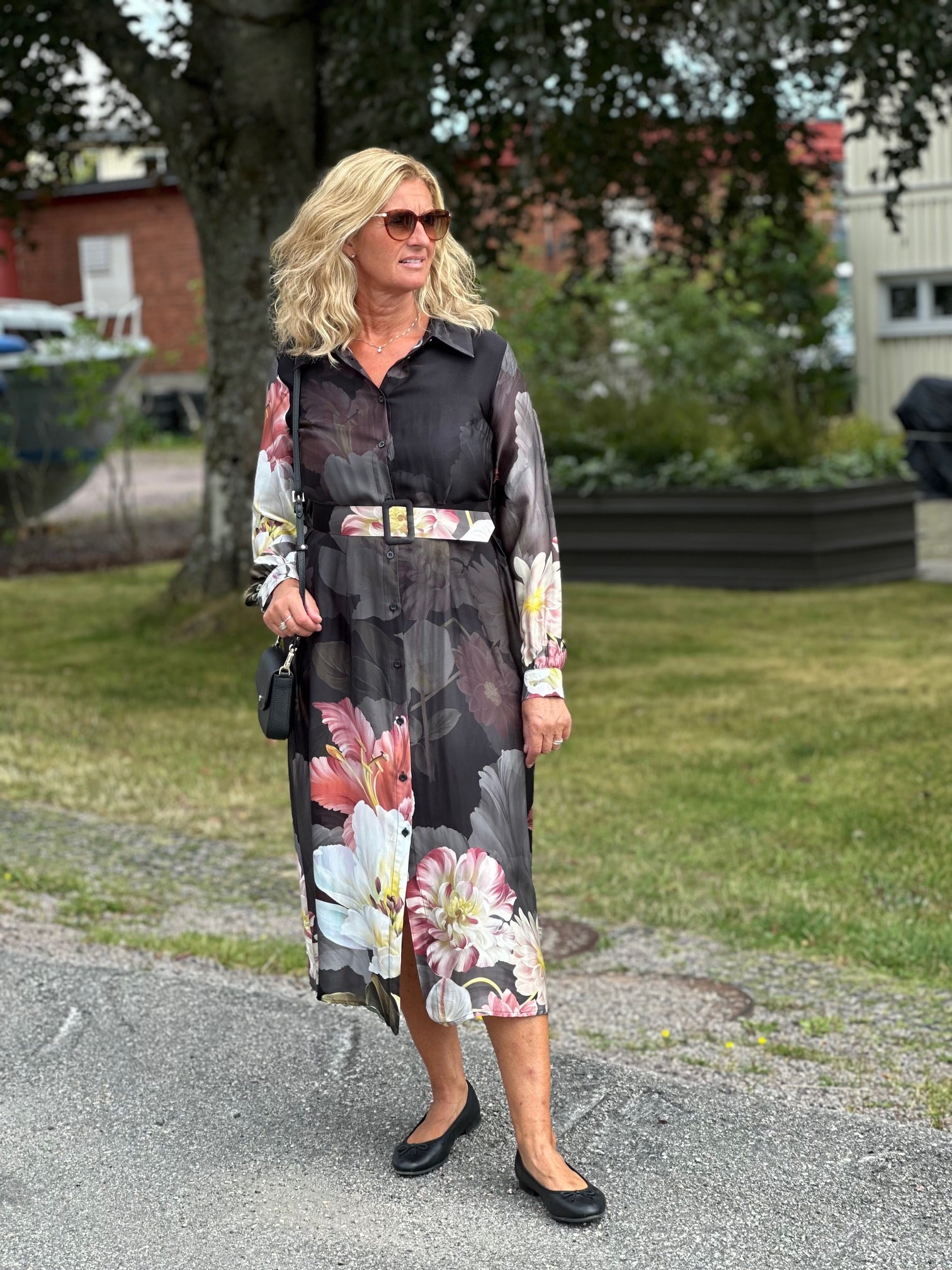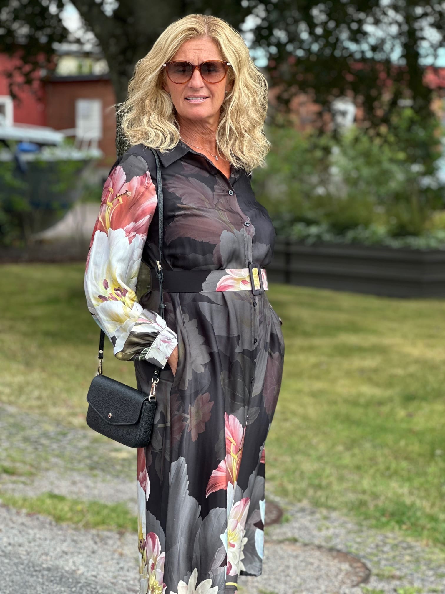 Lang kjole i viskose m/ blomster print, belte og knapper
