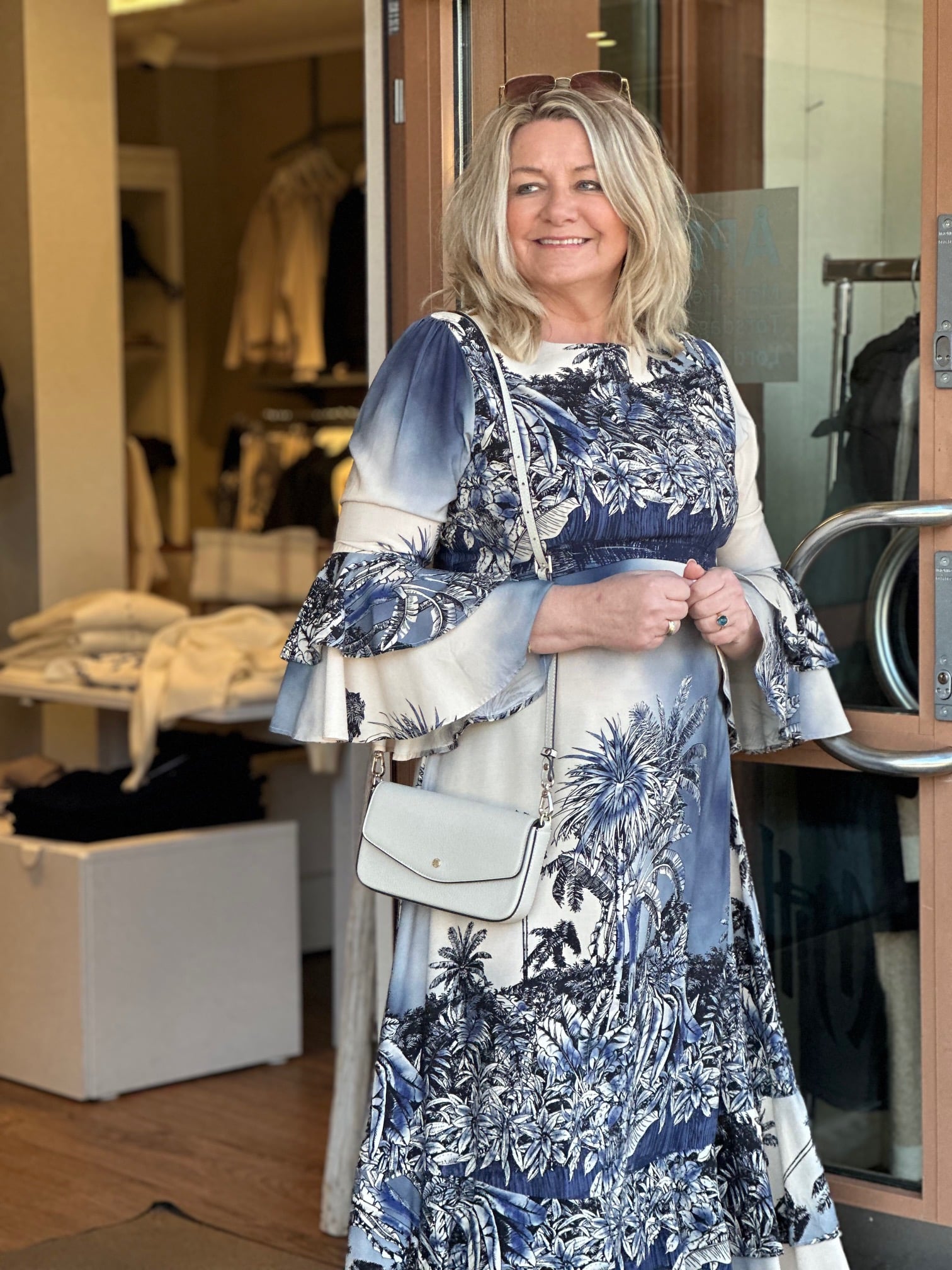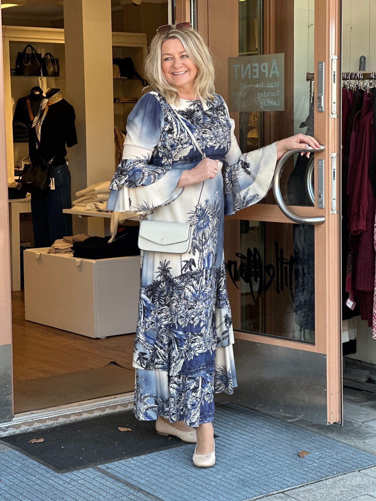 Lang kjole i viskose med volanger på ermene